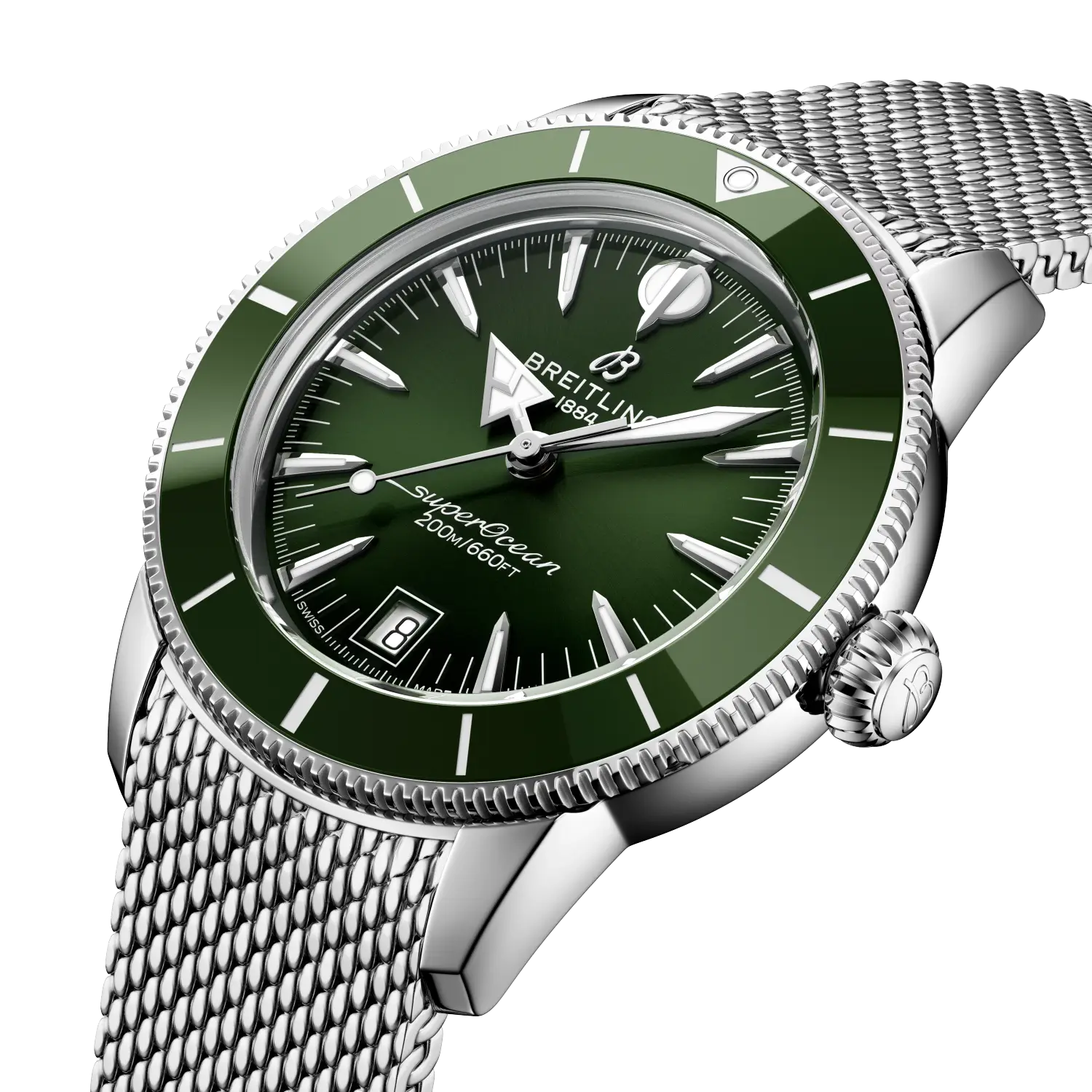波間も、ウォーターフロントも、自在に駆ける。 スーパーオーシャン ヘリテージは、ただのダイバーズウォッチではありません。最初からそうでした。ブライトリングがこのモデルを初めて発表したのは1957年。当時の他のダイバーズウォッチとは一線を画すアプローチをとっていました。Ref. 1004(洗練された3針モデル)とRef. 807(世界初の本格的なダイバーズ・クロノグラフ)は、単に水中探検のためのツールではなく、スタイルも重視したデザインでした。特徴的な槍と矢の形をした針、アノダイズ処理を施した回転ベゼル、そして自然な美しさを備えた洗練されたプロポーションが、海とスタイルを愛する冒険家たちを魅了しました。その哲学は、スーパーオーシャン ヘリテージにしっかりと受け継がれてきました。1950年代の精神を宿しながら、今の時代に合わせて磨き上げられました。 最新のSuperocean Heritageは、オリジナルの特徴をすべて踏襲し、さらに洗練されています。このコレクションには、ブライトリング初の自社製3針ムーブメント「キャリバーB31」が搭載されています。セラミックインレイのベゼルは優れた耐傷性を提供し、一体型のメッシュメタルまたはメッシュラバーブレスレットはケースにぴったりとフィットし、折りたたみ式クラスプでしっかりと固定され、すっきりとした防水仕上げを実現します。6時位置に控えめな日付表示窓と、オリジナルのシグネチャー針(時間を示す矢印、分を示す槍)が、表面の上でも下でも、視認性とバランスを確保します。
