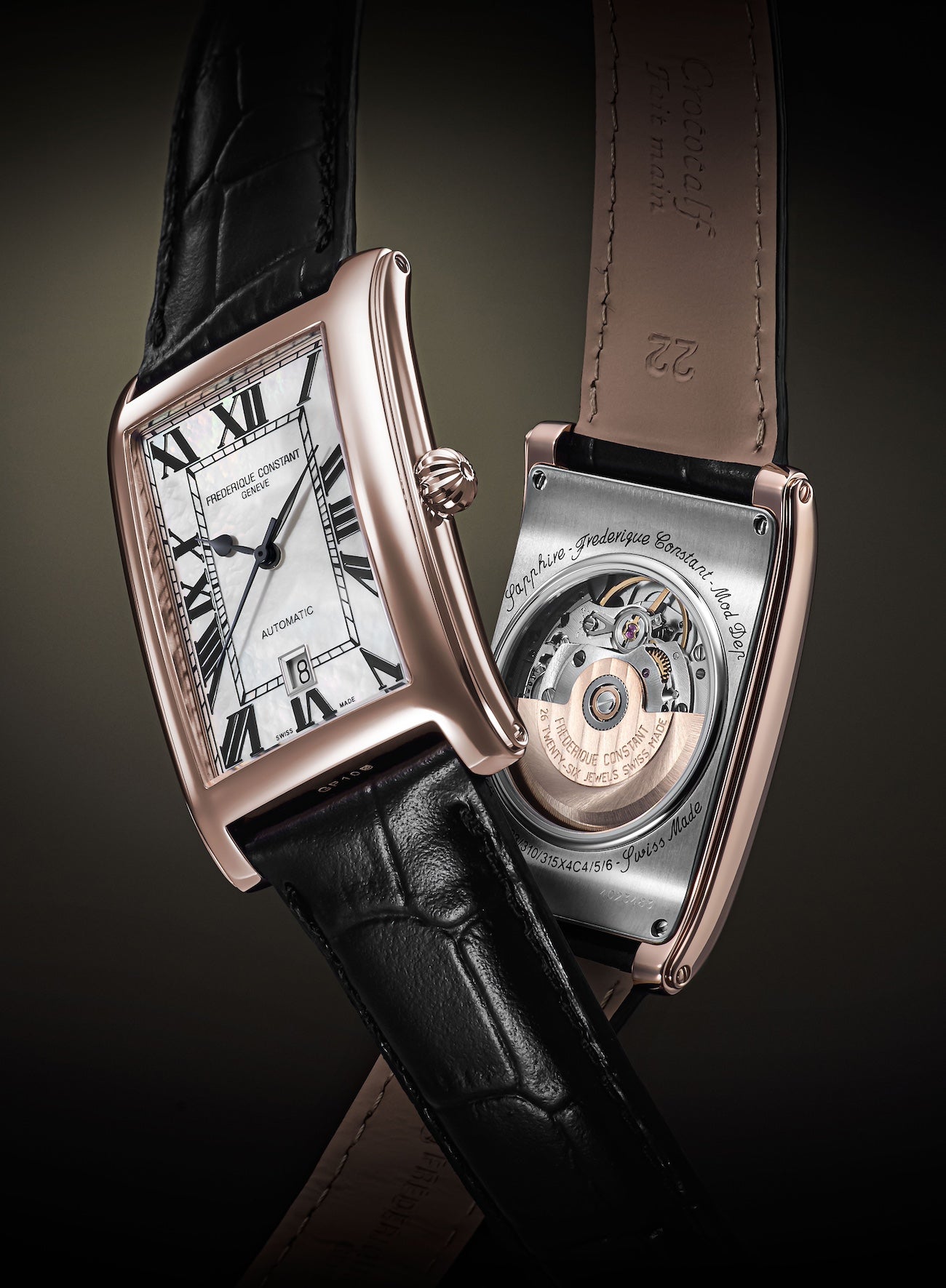 フレデリック・コンスタントのデザインDNAである<エレガント>をより体現する日本限定。文字盤には、上品な美しさ、そして天然素材のため同じ模様が存在しないマザーオブパールを全面に採用しました。アールデコの典型的なデザインで、ケース、レイルウェイ、デイト表示と、カレ“角”をベースにしたバランスがとても美しい時計。ペアウォッチとしてもご着用いただける時計です。