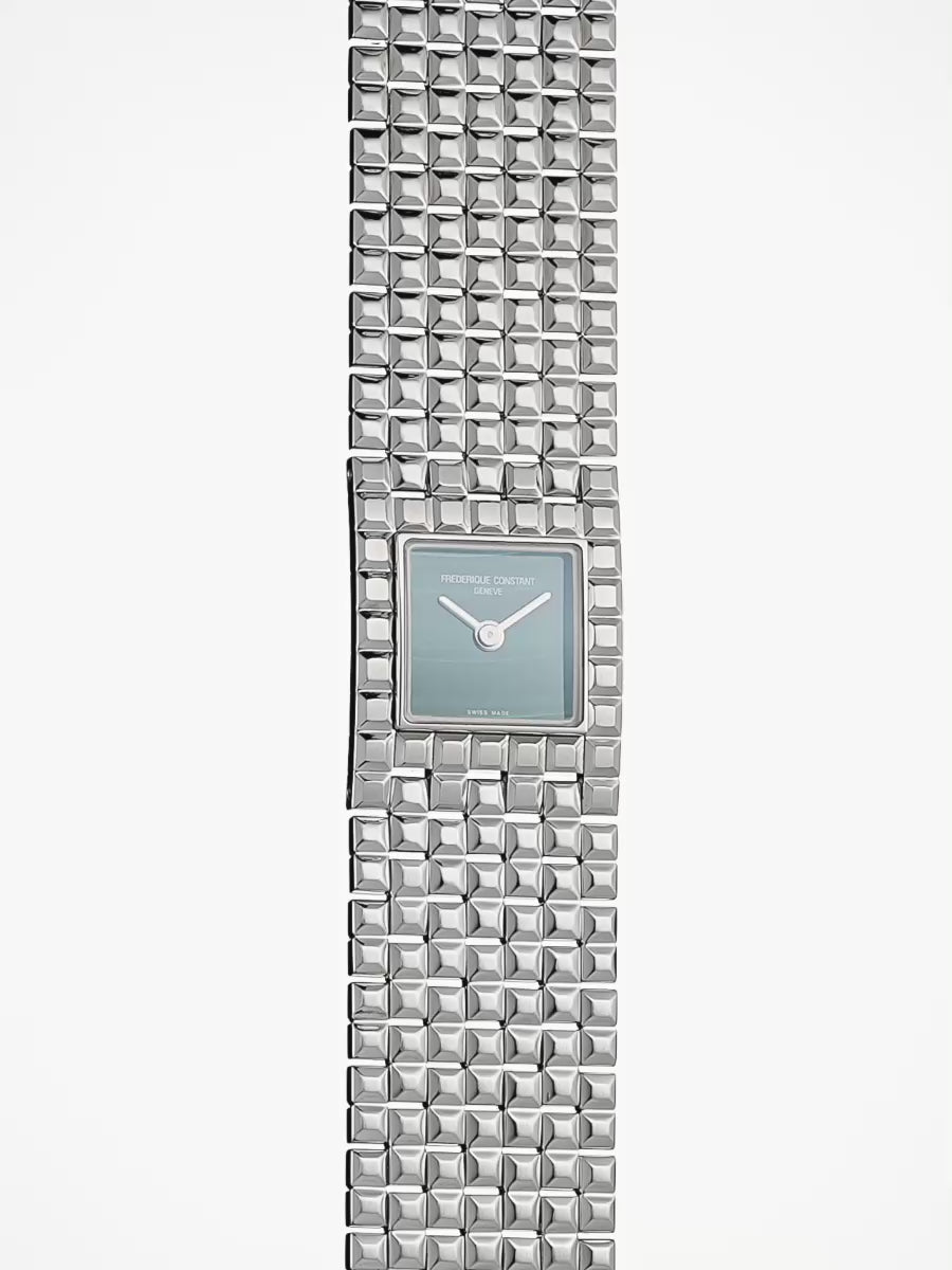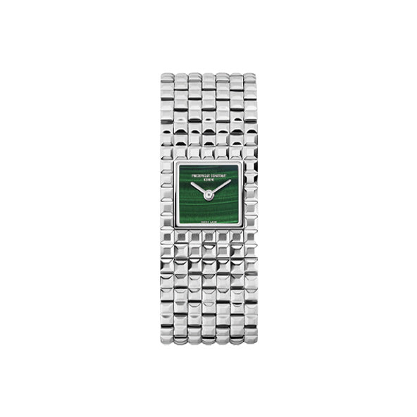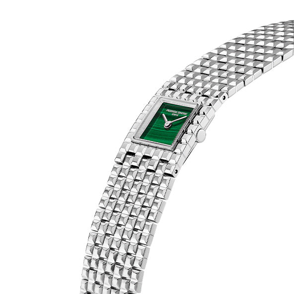20年以上ぶりに復活を遂げた、カフウォッチのアイコン「マンシェット」。“時を読む”以上に“装うこと”を楽しむ、フレデリック・コンスタントが贈るジュエリーウォッチです。7リンク構成のブレスレットと一体化したスクエア文字盤が、手元をエレガントに引き立てます。天然石ならではの表情豊かなグリーンが印象的なマラカイトダイヤル。シンプルな時分針のみのデザインが、素材の美しさをより際立たせます。